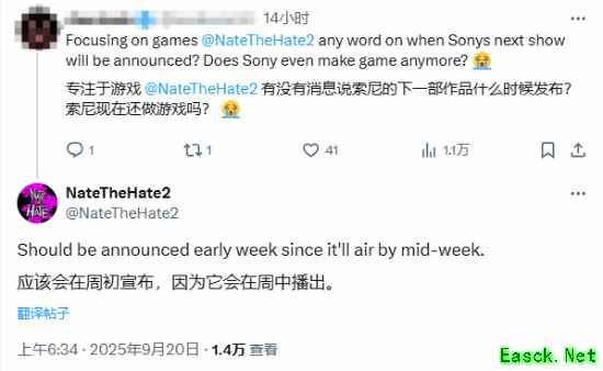 9月20,有玩家向知名爆料人士@NateTheHate2询问道:“关于游戏方面的消息,你是否有索尼下次发布会何时官宣的消息?索尼现在还做游戏吗?”@NateTheHate2则表示:“应该会在周初官宣(或为下周),因为发布会将在周中举行。”