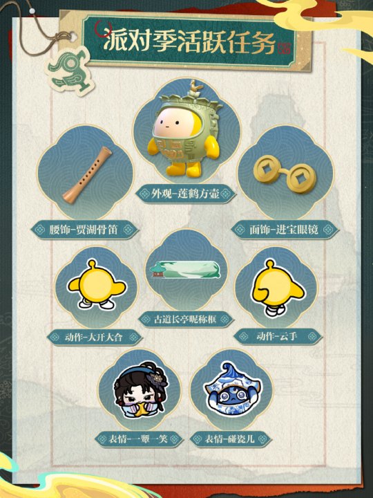 重返新世界博物馆,见证最后的真相!国民原创乐园游戏《蛋仔派对》全新派对季“国宝归乡季”于9月19日重磅开启!衔花香使璎珞、青花瓷盖宝儿和卷中美人芳仪……新世界博物馆20年来究竟发生了什么?一起跟随璎珞的脚步,探寻东方藏品的故事吧! ![]() “国宝归乡季”派对季盛大开幕 “国宝归乡季”派对季盲盒外观正式登场 文明纵经沧桑,核心永不动摇。 衔花香使璎珞这一形象的设计灵感,源自唐代盛行的金属球形香器——“银香囊”,其中我们主要以“葡萄花鸟纹银香囊”这枚文物为原型展开设计,选择了银香囊精美的镂空球体作为璎珞的外壳。 诞生于长安盛世的璎珞,历经千年,游历四方,结识了诸多好友。其中一位,就是来自新世界博物馆的莉奥拉。然而20年后,当璎珞如约重返新世界博物馆时,看到的却是雾气弥漫、窗棱破碎、青苔蔓延的荒芜景象。这里究竟发生了什么?莉奥拉又在哪里? 让我们跟随璎珞的脚步,一同见证莉奥拉的托付,与文物们的最终结局吧! ![]() 衔花香使璎珞 芳仪的设计灵感来源于清代绢本设色工笔《十二美人图》,这组图以十二种古典生活场景凝练出东方仕女的风雅气韵。倚门观竹、消夏赏蝶、立持如意……这些画中的场景都被融入了芳仪的角色设计、动作设计中。 芳仪是璎珞的好友。某个上元夜偷溜出来捞河灯的璎珞,在石桥墩下撞见了正在欣赏水边月下风景的芳仪。不撞不相识,从那以后,芳仪就经常陪着璎珞游历世间。 但——海岸线,成为她们相伴共行的休止符。当璎珞想要循着海岸线前往异国时,一直相随在侧的芳仪却就此止步。故乡有她在,远行的游子总能找到归家的路。 ![]() 卷中美人芳仪 来自东方的青花瓷,曾在相当长的时间里受到西方达官贵人的喜爱。作为盖宝儿原型的“青花花卉纹双耳四足带盖锅”,就是专为适应西方人饮食生活习惯而设计的器皿,也是当时外销瓷器中的常见器型。 多年前,盖宝儿怀着期待和兴奋乘船来到异国,最后却辗转进入了新世界博物馆,成为被封存于地下的诸多瓷器之一,还被赋予了一个毫无特色的名字——C-107。 地下储藏室的生活漫长而无聊,瓷器同伴们一个接一个离开,从此不知所踪。黑暗中,孤单的C-107做了个梦,梦里,有消失的同伴,和久别重逢的故乡。 ![]() 青花瓷盖宝儿 当博物馆穹顶落下第一缕月光,千年器灵们正以星火为引,循香而归!故园风暖,欢迎归来! ![]() ![]() 派对季盲盒 “国宝归乡季”派对手册奖励一览 “国宝归乡季”派对季的派对手册分为基础版和高级版两部分,相应的奖励各不相同。本季基础派对手册的全部奖励有:800潮流纤维、17500瓶盖、稀有表情“大无语”、高级头像框“西窗烛头像框”、稀有配饰“玉猪龙”、高级装扮“卖货郎套装”。 ![]() 基础派对手册 将派对手册升级为高级后,还能获得总价值3288蛋币的超值奖励。除了300蛋币、30彩虹币、20盲盒染色剂、20配饰染色剂外,还可获得稀有盲盒“海晏河清尊”、典藏配饰“祥云玳瑁眼镜”、稀有头像框“狸猫盘头像框”、高级昵称框“永和九年昵称框”、典藏动作“击鼓说唱”、典藏配饰“唐三彩小胖马”和稀有盲盒“戴金面具青铜像”外观。 ![]() 高级派对手册 丧彪,Ta们怎么叫你咪咪呀?典藏盲盒“兵马俑丧咪”、典藏配饰“青铜叉”及表情“蛋踏飞燕”惊喜上架。陶俑猫咪带着委托来到了蛋仔岛,快看看兵马俑丧咪需要什么帮助吧~ ![]() 手册核心奖励 参与派对季活跃任务兑换“莲鹤方壶” “国宝归乡季”派对季活跃活动正式开放!完成全新派对季活跃任务,即可前往兑换商店获取稀有盲盒“莲鹤方壶”、稀有配饰“贾湖骨笛”、“进宝眼镜”,更有派对季限定全新表情“一颦一笑”、“碰瓷儿”,动作“大开大合”、“云手”,和“古道长亭昵称框”等奖励等待兑换。 ![]() 派对季活跃任务 完成蛋位任务、铁蛋五项及派对季故事赢派对奖励 “国宝归乡季”派对季开启后,游戏将根据蛋位继承规则对玩家蛋位进行降级继承。与此同时,新派对季的开启也带来了新的蛋位任务,完成指定任务,即可领取外观“奶黄小包”、 “讲解员套装”,配饰“竹简墨书”,及“雁字回时头像框”等丰厚奖励!铁蛋五项奖励同步开启,可获得“红枫寄秋头像框”。 来到20年后的新世界博物馆,一起探寻“国宝归乡季”的全新篇章。《蛋仔派对》全新派对季剧情篇章重磅开启,体验剧情完成任务即可获得动作“多情舞”,领取派对季专属奖励! ![]() 蛋位任务&铁蛋五项&派对季故事奖励 蛋圈任务兑换商店 “国宝归乡季”派对季盛大开启,蛋仔们可通过蛋圈页面进入蛋圈任务,和蛋圈成员一起组队完成任务,即可兑换呦呦“蕉不急”、配饰“甜蛋糖画”和双人动作“高跷对决”! ![]() 蛋圈任务兑换商店 派对季主题关卡欢乐来袭 全新派对季“国宝归乡季”盛大揭幕,全新派对季主题关卡等待挑战!新世界博物馆的东方馆——万象藏珍楼正散出丝缕雾气,雾气之下,掩藏着怎样的过往?请前往“三维蛋球”、“画中世界”、“石章迷途”、“活字沉浮”等十大关卡探索新派对季背后的故事,见证最后的真相吧! ![]() 新派对季主题关卡 下一站终点站——故乡!国民原创乐园游戏《蛋仔派对》全新派对季“国宝归乡季”于9月19日重磅揭幕,一起见证文物们的最终结局吧! 【关于《蛋仔派对》】 咔咔~欢迎光临蛋仔岛!(*?▽?*