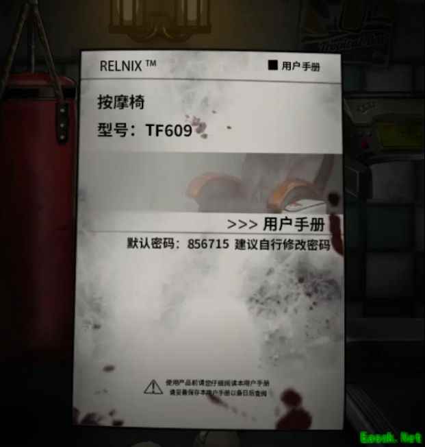 左右两边都可以调查的话,习惯先查看左边。把地上的娃娃移开后,发现了按摩椅的说明书,上面显示初始密码是856715。之前提到过不要偷懒使用原始密码或简单反向设置,等会儿我们可以尝试输入这个密码。