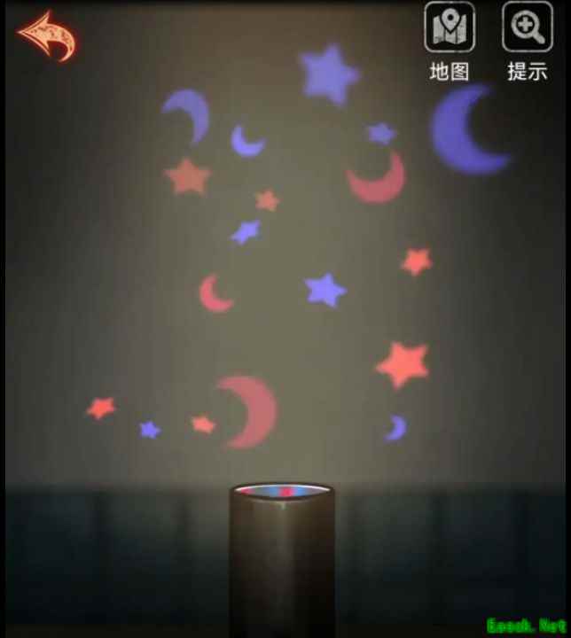 将灯泡安装在桌面上的小夜灯上,再套上灯罩,灯光在墙上投射出红蓝相间的星星和月亮图案。其中红色的月亮有3个,星星有6颗,蓝色的月亮4个,星星5颗。