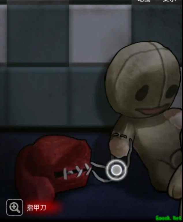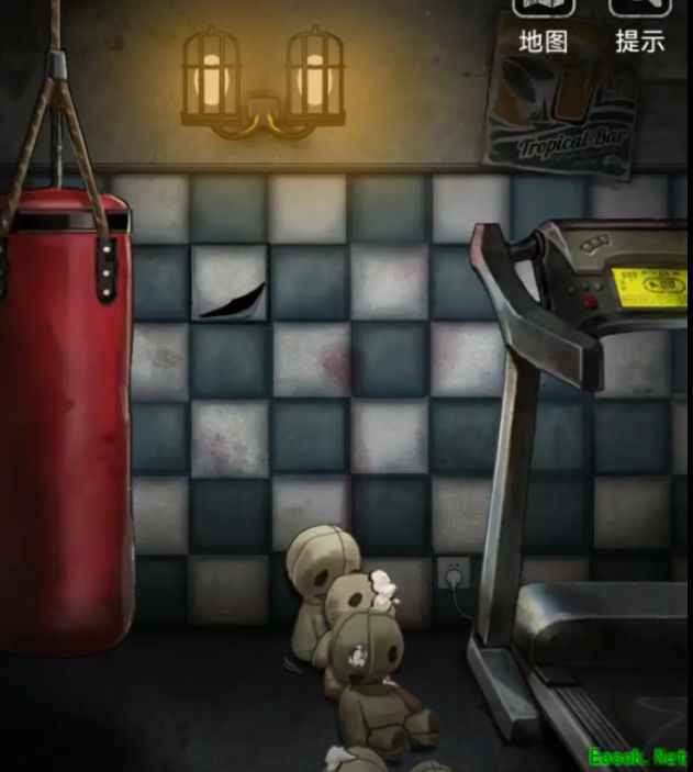 接通跑步机电源后,旁边插座处滚来一个玻璃眼球将其取走。按下跑步机左侧红色按钮启动设备,获得蓝色小人头。最后方的小人偶与拳击手套缝合在一起,使用指甲剪剪开缝线获取手套。戴上拳击手套击打沙袋,击落橙色小人头。