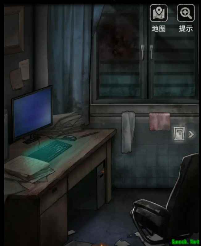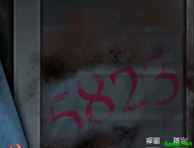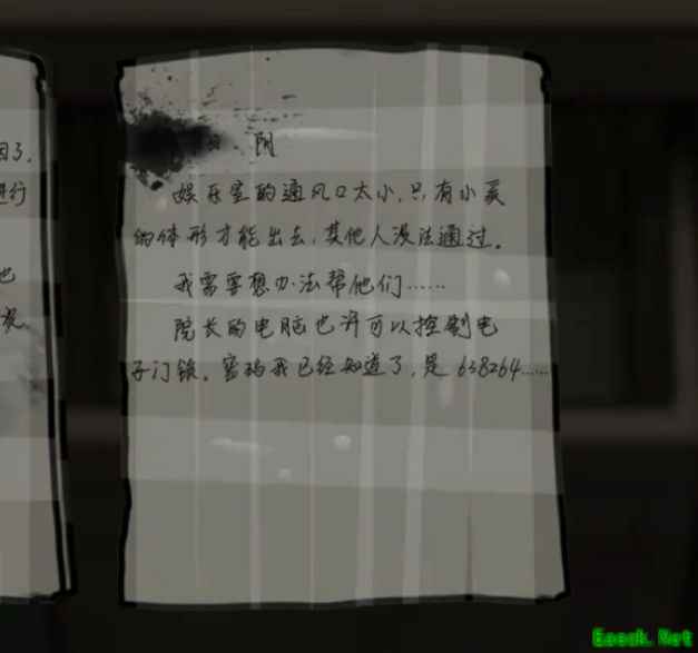 先找一面镜子或将图像翻转,可以看到密码为5823。尝试用这个数字作为电脑密码,但位数不符。注意到桌子左下角有一个四位密码的抽屉,但还需其他线索。查看桌上堆放的纸张,提示显示31号病人曾倒挂在院长室偷窥。结合这一信息,将抽屉密码设为5823,成功开启后取得电脑密码638264,然而还未等输入密码,剧情便进入紧张时刻。