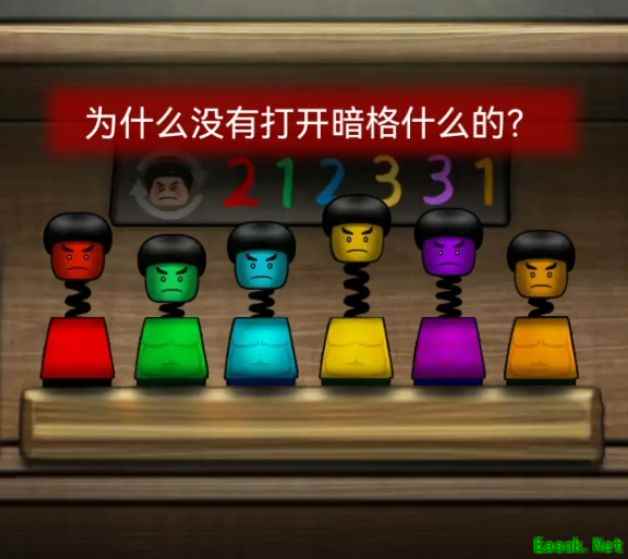 回到中间场景,先用拳击手套取下灯泡。接着,将蓝色、绿色、橙色的小人头安装到位。根据提示,小人头上画有旋转标记,需按对应颜色旋转相应圈数。调整完成后,小人会自动转头(效果未知是否为高能反应)。各小人头的高度顺序为黄、紫、红、蓝、橙、绿,建议提前记录。