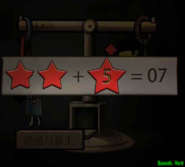 2011房间为双人病房,用44号病人的兔耳发带将57号病人吊起,寓意消逝;右侧小男孩病人手持小旗,象征新生。完成操作后,天平平衡,触发机关打开暗格,得到一张密码纸,提示为:一个星星加一个星星再加上一个标有5的星星等于7,说明无数字的星星代表1,有数字的则以其数值计算。