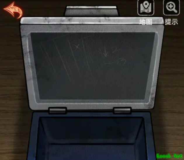 注意盒子盖上还有一个小线索,上面有一道浅浅的类似藏宝图的划痕,提示向下2格、向右3格,似乎暗示着有宝物埋藏。前往最左侧的房间,从墙砖的左上角开始数,向下2格、向右3格,大致位置在沙袋黑色带子偏右的地方,用勺子挖掘即可找到海绵和一把钥匙。
