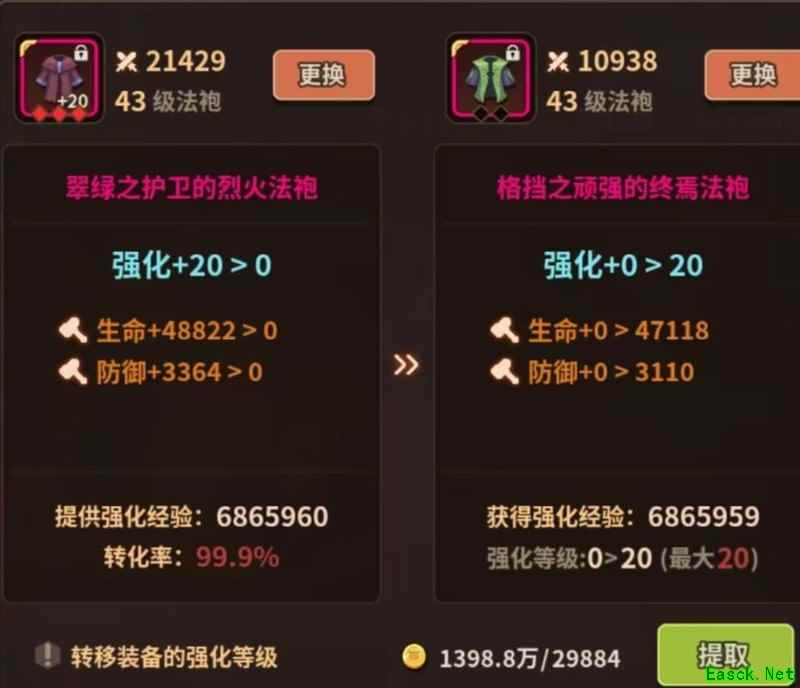 强化转移:可将强化经验转移过来,若你的40、41级装备仍有磨损,同等级装备基本能完全继承强化效果。