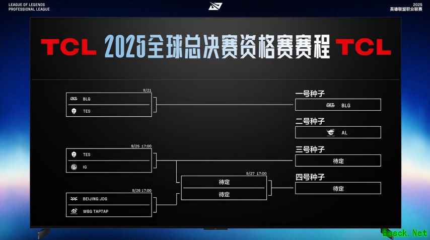 资格赛9月25日揭开战幕,全球总决赛重返中国 随着BLG战队夺冠成为LPL赛区一号种子,AL战队成为除冠军外全年积分最高成为二号种子,剩余的两个赛区名额,也将在9月25日-27日期间,于深圳NIP主场进行的全球总决赛LPL赛区资格赛中揭晓。 届时,9月25日由TES战队对阵iG战队,争夺LPL赛区三号种子席位的比赛将率先打响——而这场对决遗憾告负的一方,则将于9月27日,迎接北京JDG及WBG TapTap之间的胜者的挑战,争夺LPL赛区最后一个晋级名额!
