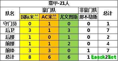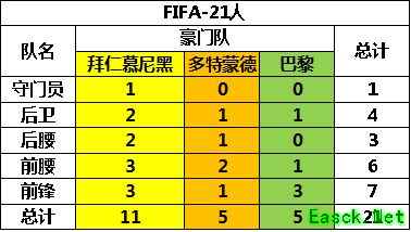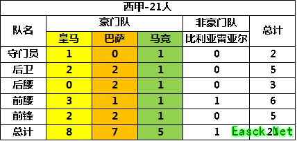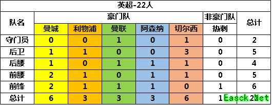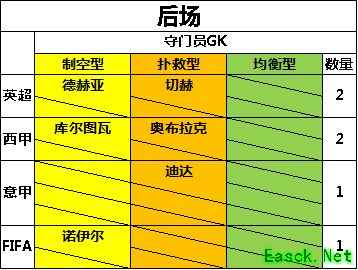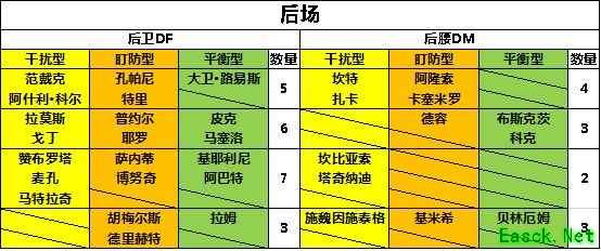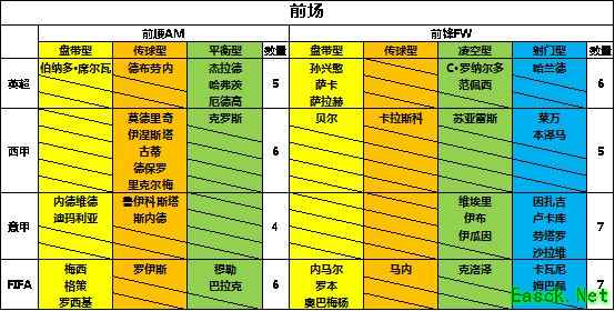 从图中结果来看,四个阵营的球员数量大致相近,仅英超比其他阵营多出一人。然而由于英超俱乐部数量比其他三个阵营多出2至3家,因此英超球员在各俱乐部之间的分布相对较少。具体来看,英超中曼城和切尔西拥有的球员最多,西甲中以皇家马德里为首位,意甲中则是国际米兰领先,而FIFA阵营中拜仁慕尼黑占据主导。此外,除了FIFA阵营之外,其他三个阵营中均有来自非豪门球队的球员代表。 观察前后场球员类型统计数据表。