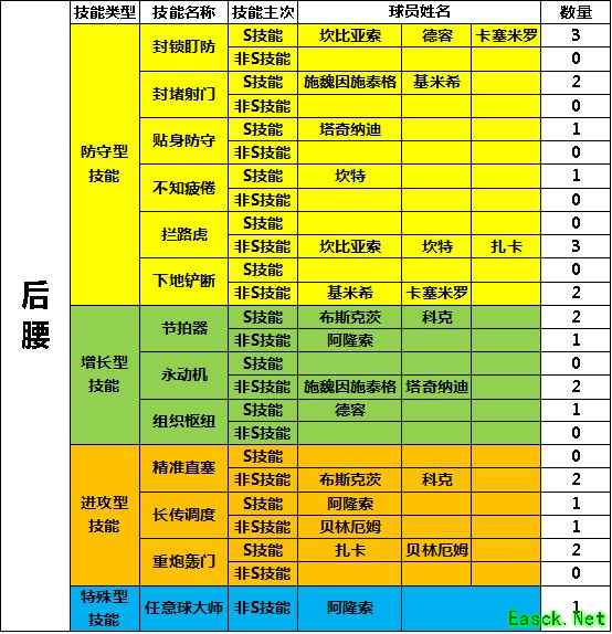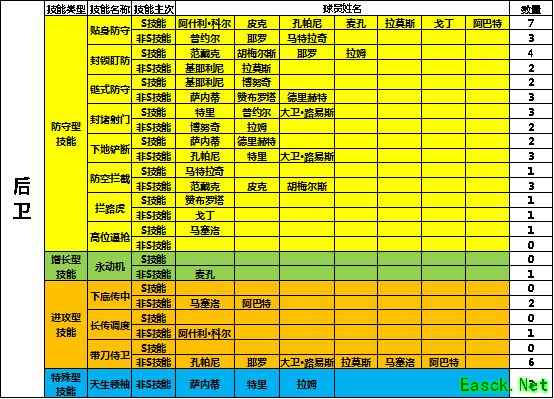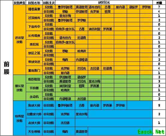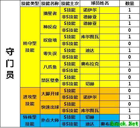 从图中可见,西甲拥有众多传球型球员,却缺少盘带型球员。这让我想到了瓜迪奥拉的SP技能,可永久提升传球能力,或许可以尝试一些另类或趣味性的玩法组合。 另外还有一些特别之处:马内是唯一的传球型前锋,SS守门员中没有平衡型,因此平民玩家首选平衡型的布冯。西甲拥有两名技能完全相同的平衡型后腰。其他特别之处请大家参考图片自行发现。 最后来看看这款游戏最有趣的核心内容:球员技能。合理的技能搭配能让战术更加多样,阵容更加强大,推图更轻松,挑战更强对手也更简单!