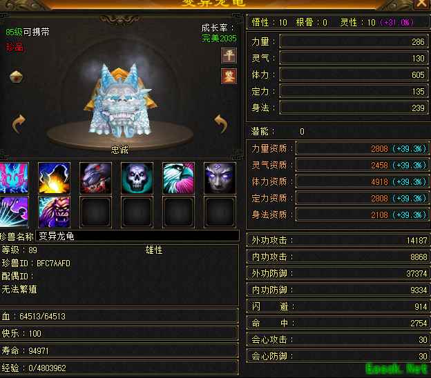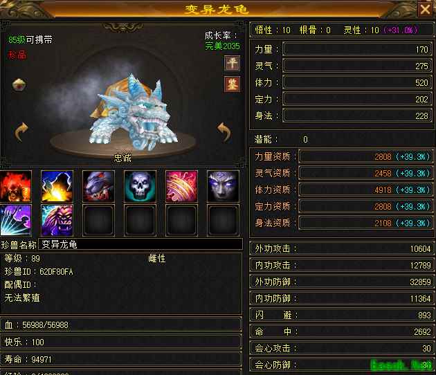 这套装备有多豪华?这么说吧,全身都是带体力、带身法、带会心、带所有属性的极品大八星,雕纹是顶级的,宝石更是直接配好了全套6级、7级(根据所在等级段)。 旁边还有三个方案页,随时可以根据对手的门派,切换不同的抗性石头。 装备拉满了,宝宝也不能差。系统直接准备好了几只毕业级的PVP神宠。瞅了一眼,这只变异龙龟,完美2035的成长率,体力资质直逼5000。