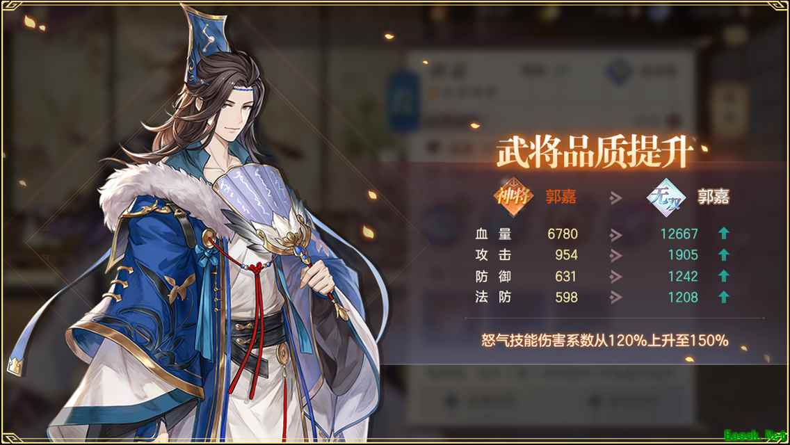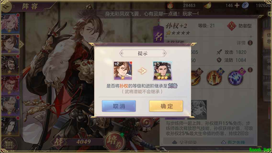 【一键零损换将,体验无负担养成】 除了全员无双外,游戏还设有零损换将系统,在阵容界面选择切换武将,所有养成资源,例如等级、阶级、装备等都可以一键全部继承到新武将身上,不再担心前期养错卡造成资源浪费,或者重复培养新卡耗费大量精力。玩家只需要集中养成队伍中的6位武将,便可让卡库中所有武将都上场,享受更轻松的武将培养,放心尝试各种阵容。