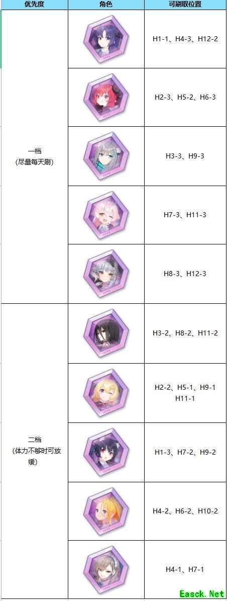 终于来到大家最关心的角色推荐部分。相信此前关注过游戏的玩家对强势角色已有一定了解,接下来我将结合推荐角色,深入分析他们的优势与不足,帮助你更好地理解每个角色的特点和适用场景。 人无完人,作为日服开服的老玩家,我也不敢说自己已经完全看透这个游戏。虽然有些观点可能未必准确,但基于长期积累的经验,我对整体方向还是很有信心的。希望各位新手玩家看完后能建立起自己对角色的理解,那就最好不过了。 先给懒人一张图看吧。 新手角色选择指南 因此可大致得出困难图碎片的获取建议。 刷取推荐 如前所述,角色培养尤其是技能升级是游戏中最耗费资源的部分,以下是角色技能强化所需材料的简要列表。 材料简表 从数据来看,EX技能升至3—4级、小技能升至7—8级所需的金币呈爆发式增长。将一个角色完全培养成型所需的资源,足以将整支队伍的角色提升到中上水平。而推图更看重整体实力,因此在角色养成初期,切勿将所有资源集中投入单个角色,即使是多人权角色也应合理分配资源。 对于一个角色来说,EX技能达到2级,以及小技能升至3—4级、6—7级、9—10级时,会带来较为明显的数值提升。许多EX技能在升到3级时还会额外增加词条或特殊效果(例如星野的EX技能3级时,喷子附带眩晕效果)。因此,在前期培养角色时,建议将EX技能升到3级,小技能升到4级,最高到7级即可,也就是常说的3777配置。这样的培养程度已经足以应对大部分推图和总力战的需求。如果队伍中拥有一名达到这一标准的角色,说明你已经进入游戏的中期阶段。若还想进一步提升,可能是角色的等级或装备尚未达标,或者你已经进入游戏后期阶段。此时,你应该已经对角色强度、资源分配有了自己的判断,再根据实际情况考虑将技能升到4级或5级也不迟。 在游戏前期,角色技能的培养顺序建议优先考虑输出角色,其次是奶妈(如小护士),确保队伍有足够的治疗保障,避免因治疗不足导致战斗失败。接下来可以培养辅助角色(如小玉、茜),她们的作用在总力战中更为明显,推图时辅助效果并非必不可少,因此可以适当延后培养。最后再考虑坦克角色,因为前期坦克的生存能力主要依赖装备和等级提升,技能培养可以暂时放缓。总体来说,合理分配资源,优先保障输出和治疗,能够更高效地推进游戏进程。 针对角色内技能强化推荐顺序,以下分情况讨论。 通常优先选择EX技能,其次是基础技能,接着是伤害增益类被动技能,随后是伤害提升或追加伤害的辅助技能,最后是对输出无帮助的被动与辅助技能。 伤害增益型包括攻击、爆伤、攻速、暴击等能显著提升伤害的增益效果。 无增益buff是指不提升血量、命中、闪避和回复效果的强化状态。 举几个例子说明如下 1、阿鲁 爱露的技能配置非常出色,EX技和基础技能均为输出型,被动与辅助技能提供暴击与爆伤加成,强化伤害效果明显,整体以输出为核心,技能升级顺序清晰明确。 2、伊织 伊织的技能整体表现不错,但她的被动技能是提升命中,而佐仓本身使用狙击枪,基础命中已经很高,对付主线普通敌人完全够用,因此这个被动可以暂时不优先升级,甚至等到中后期再点,专门用于应对竞技场中的佑香或狗盾。 3、瞬 最后提一个特殊例子,瞬能在竞技场中拥有人权卡地位,主要得益于其开场爆发费用的小技能。由于EX技能升级并不提升伤害倍率,仅增加暴击值,因此瞬能的技能加点优先级为:基础技能>被动与辅助技能>EX技能。 通常技能升级优先级为EX技能最高,其次是对前排有伤害加成的辅助技能,最后为基础技能和被动技能。 虽然后排输出重要,但前排角色对战局影响更大,因此应优先选择能提供前排伤害辅助和增益效果的角色,前期携带前排攻击或暴击伤害提升的学生更值得关注。 这样一来,这个buff的有无反而成了判断是否要拉这个学生的关键标准。 若角色缺乏前排输出增益效果,通常无需特别培养。 看她的EX技能表现如何再决定。 后期会加入加速回费的辅助效果,技能释放更频繁,单位时间内伤害输出显著提升,整体伤害能力增强。 举个例子会更快说明问题。 1、响 响的辅助技能选择了爆伤加成,技能组表现出色,推图体验流畅,值得投入资源培养。 2、好美 好美和响的技能组较为相似,同星级同练度下,好美的基础攻击略高。但由于她的辅助技能是提升群体控制效果,在前期缺乏清场能力时可暂时使用。不过从长远来看,现阶段培养价值不高,后期即便在特定总力战中可能派上用场,也大概率会有更合适的替代卡。 通常技能升级优先级为EX技能最高,其次是提升前排伤害的辅助技能,接着是增加治疗量的被动技能,基础技能随后,其他辅助技能最后。 主要思路是提升对奶量和前排输出都有正面效果的技能。 举个例子会更直接明了。 1、芹娜 小护士的优势在于她的技能组非常全面,就连一些小技能也具备加血效果,这是其他治疗角色所不具备的特点。因此,优先提升基础技能是非常有必要的,被动技能带来的奶量加成也相当实用。不过,辅助技能提升的前排群体控制抗性在实际战斗中作用有限。前期敌人基本不会控制,后期即便遇到控制类敌人,除了坦克之外,输出角色本身的控制抗性就比较低,实际效果并不明显。综合来看,技能升级的优先级应为:EX技能 > 基础技能 > 被动技能 >>>>> 辅助技能。 2、花江 花江不像前辈那样具备基础治疗能力,