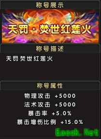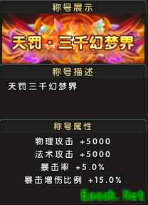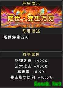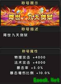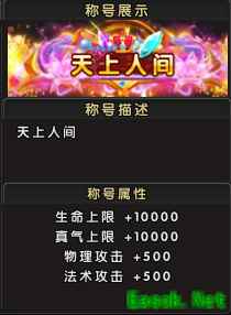 称号属性:生命+10000,真气+10000,物理攻击+500,法术攻击+500; 称号名称: