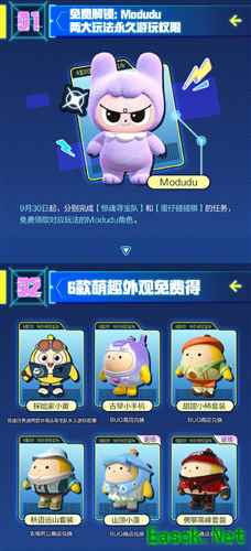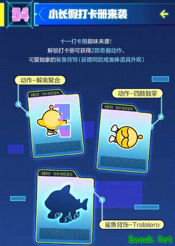 十一打卡册趣味来袭!解锁打卡册可获得2款奇趣动作、可爱抽象的鲨鱼背饰(获赠同款咸鱼棒道具外观)!