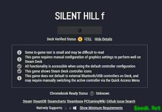 在SteamDeck的测试网站Protondb上,他们为《寂静岭F》给出了“可玩”评级,并指出虽然用SteamDeck玩有些问题,但还是可以愉快游玩的。