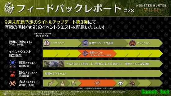 调整28:追加历战个体(★9)怪物 将轮换发布“雪狮子王”“护雷颚龙”“赫猿兽”历战个体(★9)的活动任务。 报酬:计划为发光护符、重铠玉、七色金石等。 以历战个体形式登场的怪物将带来不同于以往的狩猎体验,敬请结合其他各类活动任务与季节活动,积极发起挑战。