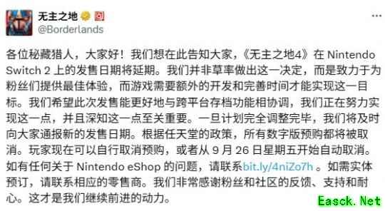 依旧艰难的决定! 《无主之地4》Switch2版被无限期推迟
