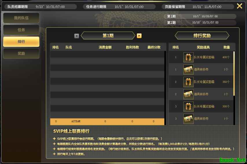 一.活动时间: SVIP线上联赛队员招募期 SVIP线上联赛任务进行期限 SVIP线上联赛排行 活动期间,排行会进行[两期]。每期进入排名即可获得丰厚奖励