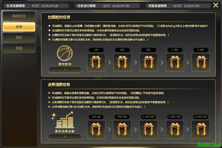 三.活动任务说明(分为比赛胜利任务和点券消费任务) 比赛胜利任务-活动期间根据[3vs3匹配赛(包括跨区匹配)]累计胜场数,全体队员可以获得对应奖励。(只有职业RatingB及以上角色的胜场才会统计)活动期间仅可首次达成任务时获得奖励,任务完成时奖励将自动发放至奖励页面。比赛胜利任务每个档位奖励活动期间只能获得1次。(若更换队伍,则已经获得过的奖励将不能重复获得。)(比赛胜利场数记录与队员退队无关,即使有队员退出队伍已累积的胜场数也不会减少。) 点券消费任务-活动期间根据全队成员点券累积消费金额,全体队员可以获得对应奖励。(包括赠送/不包括代金券消耗)活动期间仅可首次达成任务时获得奖励,任务完成时奖励将自动发放至奖励页面。点券消费任务每个档位奖励活动期间只能获得1次。(若更换队伍,则已经获得过的奖励将不能重复获得。)(点券消费金额记录与队员退队无关,即使有队员退出队伍已累积的金额也不会减少。)