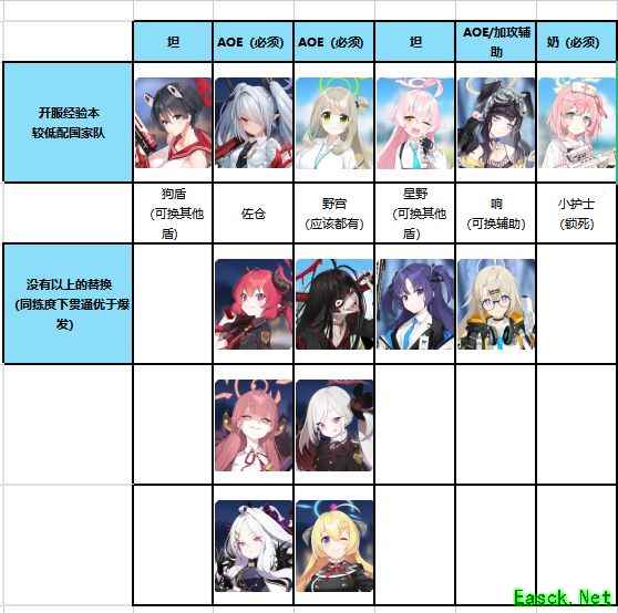 经验本扫荡需三星,条件与战斗S胜一致。 经验本中的小怪均为重甲单位,且以波次形式出现,形成大量怪海,建议优先使用贯通型AOE角色清理,实在人手不足再考虑爆发型AOE角色,避免使用神秘类角色。战斗中要注意,当前排阻挡较多敌人时会出现后退机制,建议用小护士的医疗包适时拉住前排单位,保护后排安全。 推荐阵容搭配如下 推荐配队