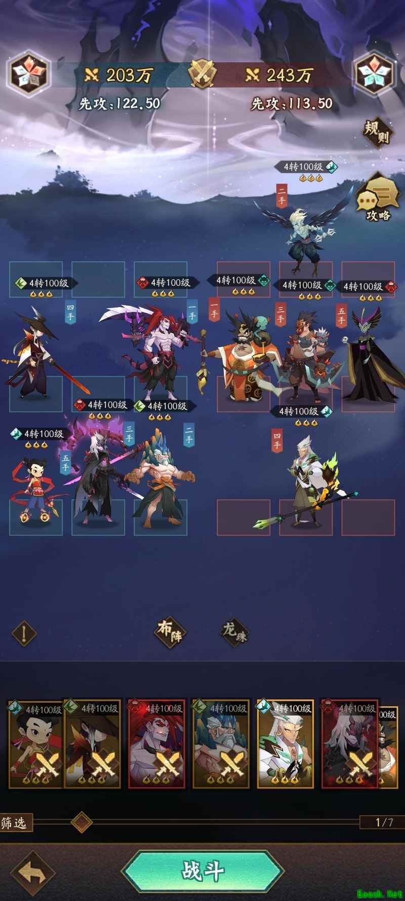 战斗分析:傀儡师通过变形术短暂控制石矶娘娘,哪吒则能封印对手被动,令熊猫酒仙阵亡后无法分裂,便于迅速集火击杀。 盘古神石 推荐阵容与站位安排