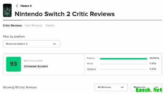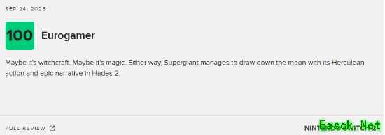 点击查看MetaCritic实时评分>>> Eurogamer:100分 评测平台:Switch 2 点击查看详细评测>>> 或许是巫术使然,或许是魔法之力。无论如何,在《哈迪斯2》中,Supergiant工作室凭借其极具魄力的动作场面与宏大的叙事,成功打造出了一款堪称 “摘月” 级别的佳作。
