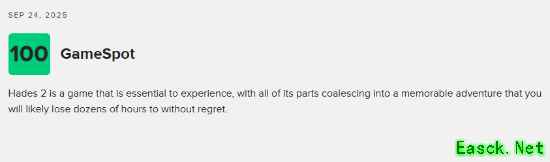 GameSpot:100分 评测平台:PC 点击查看详细评测>>> 《哈迪斯 2》是一款绝对值得体验的游戏 —— 它的各个部分完美融合,构成了一段令人难忘的冒险之旅。即便你为此投入数十个小时,也定会毫无遗憾。