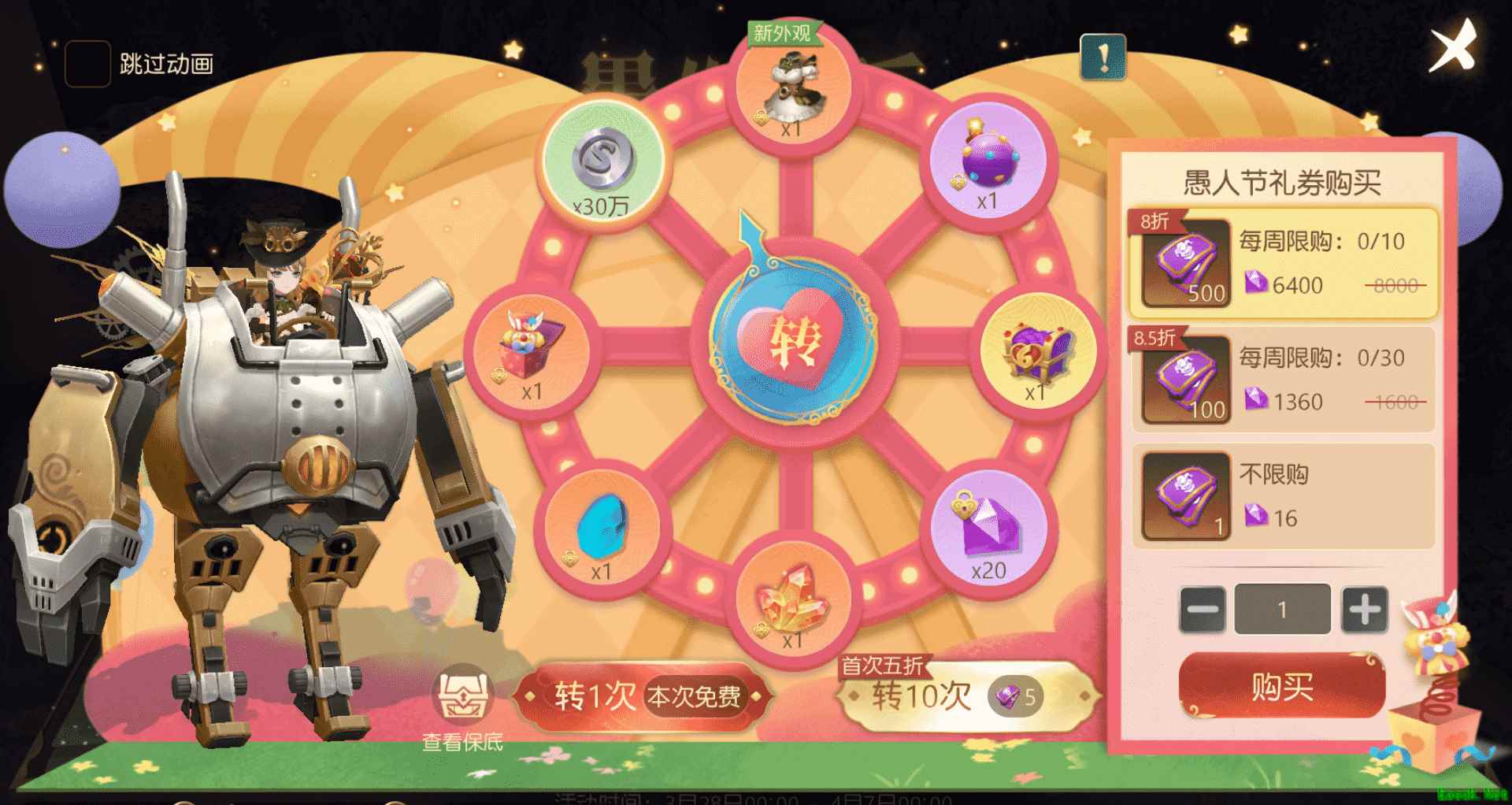 趣味答题 幸运转盘再上线!每日免费第一抽 奥兹国王送来福利!每日上线免费第一抽,100%中奖! 【参与方式】:愚人节活动面板点击“幸运转盘”进入 【奖励说明】:“时光旅人”活动限定服装有概率获得,更有尖叫匣、金色典籍随机宝箱和高级幸运石等道具奖励!