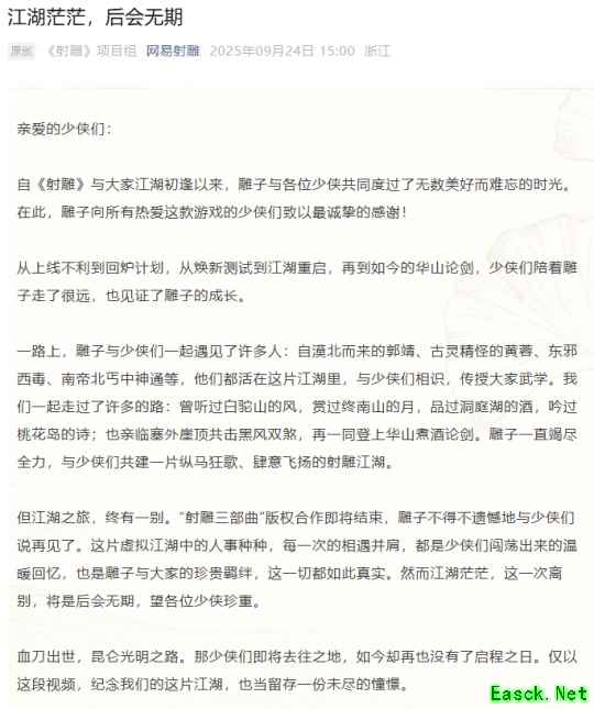 网易《射雕》11月24日停运 10亿研发也难逃宿命