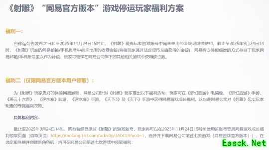 据网易《射雕》官网公告,《射雕》游戏将于2025年11月24日15时终止运营,9月24日14时起,关闭全平台下载入口,玩家将无法下载本游戏,同时关闭游戏充值、新用户注册。这意味着,这款预计耗费10亿研发的重磅游戏大作,也逃不开停服的宿命。 官方在解释停服原因时透露,网易公司与明河社针对《射雕三部曲》IP的合作期限即将届满,同时游戏运营策略也进行了调整。这两个因素共同作用,最终促使官方做出了停服的决定。而据媒体透露,游戏停运后,项目组所涉员工将优先活水至公司其他项目。 回顾《射雕》过往 全是少年意难平 《射雕》游戏历经六年研发,于2024年3月28日公测,但上线之后,口碑不如预期,且人气还逐步下滑。当时的争议主要集中在游戏的美术风格上,二次元画风与射雕IP的受众群体并不十分契合。但更深层的原因还在于,《射雕》整体的游戏定位都迷失了方向,不仅是玩法设计,还是剧情体验,都没能满足一般武侠用户的体验需求。此外,关于游戏数值的平衡,也有很大的调优空间。 网易此时也没有因为公测失利而就此放弃,反而在2024年4月底启用新的制作人,将游戏回炉重做。产品方向从最开始抽卡式、很像二次元《原神》的单机开放世界,转变成了以武侠MMO作为大方向的产品。此外,游戏的画面建模、武学连招、PVP玩法、侠侍玩法、养成玩法、PVX升级、装备系统、产业系统、社交系统以及性能优化等等,都做了相当大的调整。 这显然是一个非常需要魄力的决策。 2025年3月13日,《射雕》2.0版本正式上线,但成绩只能够称之为尚可,iOS畅销榜最高升至第63名。尽管后续官方仍陆续推出新资料片、吃鸡、搜打撤等内容,还对游戏的交易系统进行了优化,但效果依然不是十分理想。如今版期临近,也算是压死射雕的最后一根稻草吧。 《射雕》即将停运 玩家福利方案公布 伴随射雕停运公告而来的,还有玩家福利方案。据悉,自停运公告发布之日起至2025年11月24日15时止,《射雕》现有玩家游戏账号中尚未使用的金锭可继续使用。截止至2025年9月24日14时,《射雕》玩家的网易邮箱/手机账号中尚未使用的收费金锭(特指玩家通过法定货币充值获得的金锭),网易将以等额点数的方式存储于玩家网易邮箱/手机账号里以作为补偿,玩家可继续在网易公司旗下的其他相关游戏中使用该点数。 此外,为《射雕》玩家更好地体验网易游戏,网易公司针对《射雕》玩家推出以下福利活动,玩家可在《梦幻西游》电脑版、《梦幻西游》手游、《燕云十六声》、《逆水寒》端游、《逆水寒》手游、《天下3》及《天下》手游中获得网易游戏成长福利。 同时,《射雕》项目组也在公众号发布了告别信与视频,一句“江湖茫茫,后会无期,各位少侠珍重!”尽显其中的不舍与无奈。 有玩家知道后表示震惊,居然真的停运了;也有玩家还在期待,会有射雕3.0的出现。更有玩家坦言,过两年会不会有怀旧服? 写在最后 “瓦罐不离井上破,将军难免阵中亡。”近年来,众多游戏如《归龙潮》、《食物语》、《黑色沙漠》、《白色极光》等,在经历几番起伏后,终究未能逃脱停运的宿命。而《射雕》尽管曾经那么勇敢地去抗争命运,但最终还是难逃落寞收场的结局,尤其令人感到唏嘘。虽然只是游戏,但那也是一段属于我们的时光记忆。 江湖路远,有幸相识,有缘再见。 |