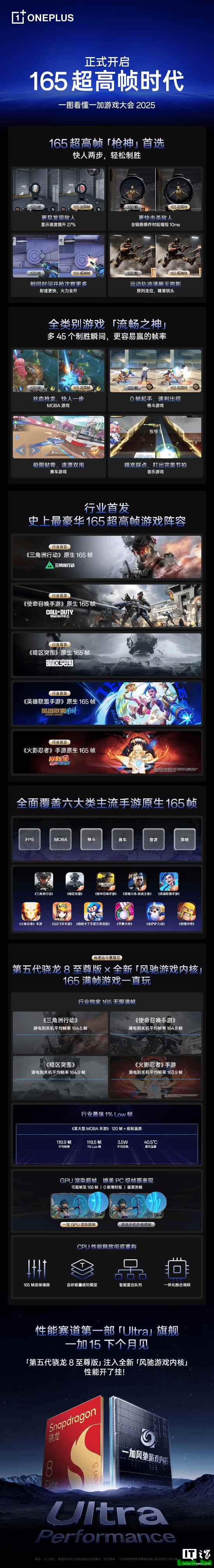 | IT之家 9 月 26 日消息,在今日举行的“一加游戏大会 2025”上,一加 15 真机亮相。一加手机官方宣布,一加 15 搭载第五代骁龙 8 至尊版移动平台,首发 165 超高帧游戏生态。