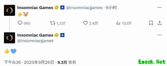 | 在《漫威金刚狼》于State of Play上正式亮相后,开发商Insomniac Games似乎调整了公关策略,选择通过官方X账号“回应”外界质疑。 该工作室近日发布的两条连续表情符号推文引发热议。第一条仅包含“????????”,被不少玩家解读为对长期唱衰《金刚狼》项目的批评者的一记“暗讽”。 紧接着,Insomniac又在回复中将小丑表情换成了蓝色爱心,似乎是在缓和语气,传达“既调侃质疑者,也向玩家表态关爱”的信息。
