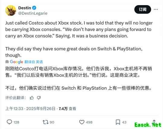 在玩家反映无法在Costco找到Xbox Series主机后,GamesIndustry.Biz跟进调查,他们发现自2025年8月6日起,Xbox主机就已在Costco网站下架。 外媒记者前往Costco门店,并致电英国另一家门店的客服部门,客服代表回应称:“我们实际上已经没有Xbox了。” Costco尚未发布进一步的确认或声明,但近几个月一直以独立记者身份进行报道的前IGN主持人兼作家Destin Legarie也曾致电美国Costco进行类似的报道,并得到了相同的答复:Costco“将不再销售Xbox主机”。 Legarie被告知这是“一项商业决定”,并且 Costco“未来没有任何销售Xbox主机的计划”。