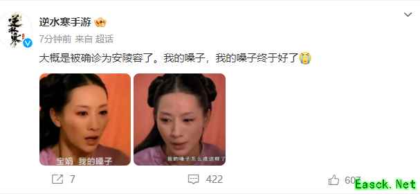 今日下午,网易旗舰级开放世界武侠游戏《逆水寒》手游官方微博发出一条消息,玩梗《甄嬛传》中“我的嗓子终于好了!”,来庆祝官博帐号禁言解除。7分钟内,就引来了400多玩家的响应。
