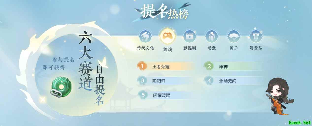 根据此前消息,逆水寒手游全新资料片“谪仙雷吟”中包含了一个联动计划“我的江湖我做主”,邀请5000万玩家投票决定联动合作的对象。截止今日,游戏赛道投票排名TOP5分别为:王者荣耀、原神、阴阳师、永劫无间、闪耀暖暖。
