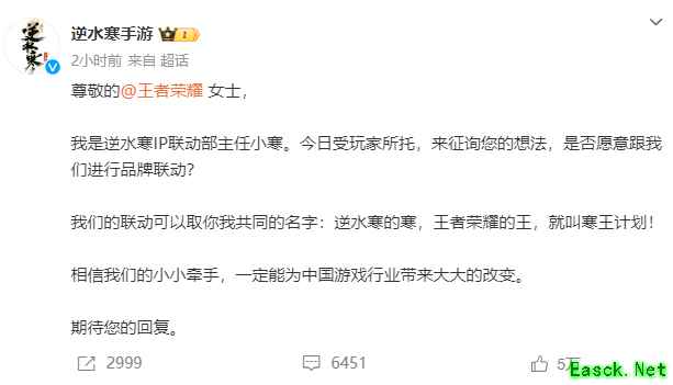 今日下午,网易旗舰武侠开放世界《逆水寒》手游微博发文称,根据玩家投票结果,希望与腾讯旗下的国民MOBA游戏《王者荣耀》进行联动。连合作名称都想好了,取逆水寒的“寒”,王者荣耀的“王”,叫“寒王计划”。