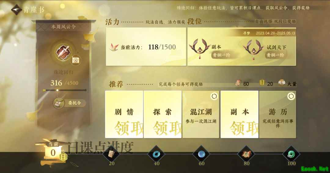 其次,以往分布在MMORPG不同系统中的不同货币,在游戏里被统合为一种名为“风云令”的资源。而这种资源,在游戏中的一切玩法里都能够被“平等”地获取,下副本也好,PVP也罢,哪怕只是一门心思地在地图里探索解密,都能够拿满这些奖励。 最后,也是最关键的,游戏中的段位奖励采用了“多轨制”,副本(PVE)、试剑天下(PVP)、公平论武(PVP)、闲趣(休闲玩法)四条赛道,玩家只要选择其中的两条走到终点,就能够拿满游戏中所有关于“段位竞争”的奖励,不想跟人打架的玩家,也许钓鱼也能钓到榜首。