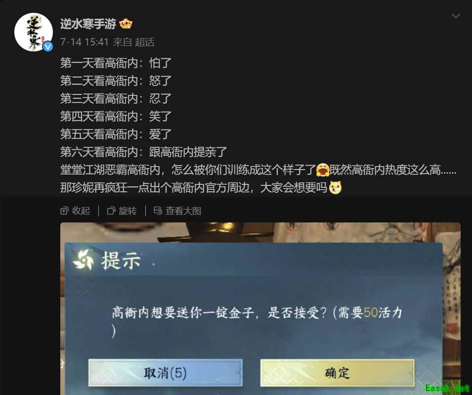 《逆水寒》手游最近放出了接下来的大版本更新PV。 看到这句话,你可能会以为我要说这次的更新有多么牛逼,内容有多么丰富,新的装扮有多么好看,以及《逆水寒》手游上线还没一个月就要更新大版本是件多么令人震惊的事情。 虽然这些话说得都不算错,但我们会有别的文章跟你吹这些,在这里我主要想跟你说的是——《逆水寒》手游有多能缝的这件事。