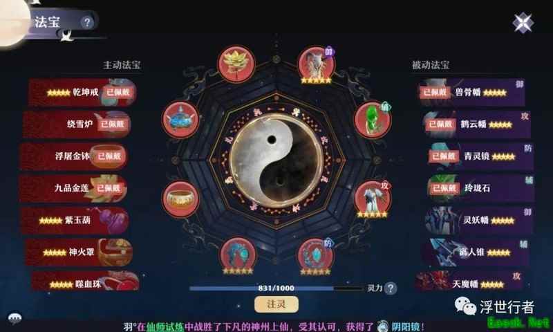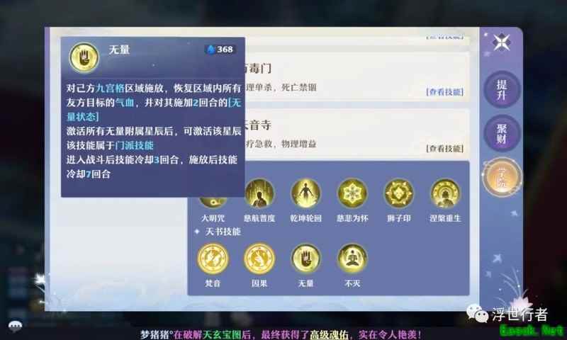主动法宝: 可根据固定队伍队友的门派选择玉净瓶或饶雪炉,搭配乾坤戒、浮屠金钵,以及九品金莲、阴阳镜或控妖笛。 乾坤戒与浮屠金钵是必备法宝,其他可根据实际情况选择携带。元素类法宝在兽四中较为常用,通常和尚需在进入第四层的第一回合使用冰系法宝冻结全场。九品金莲则多用于PVP战斗中。 被动法宝: 兽骨幡、灵妖幡、鹤云幡、青灵镜与玲珑石组合使用。 根据首发灵兽类型选择兽骨幡或灵妖幡,鹤云幡提升速度,青灵镜增强法术防御,玲珑石则可提升治疗效果。血炼配合灵慧下装能实现低怒气枯木状态。 天书推荐: 将星技能: 梵音效果:释放狮子印时,为主目标额外提升25%物理攻击加成。因果效果:处于涅槃状态复活时,恢复的生命值提升至目标最大生命的12%。 梵音对狮子印的加成效果提升了25%,使整体效果达到原来的125%,提升幅度并不明显。因此,行者更推荐选择因果(如果固定队伍中物理门派较强,也可考虑梵音)。在触发涅槃复活后,还能多抵挡几次元素伤害。 主星技能: