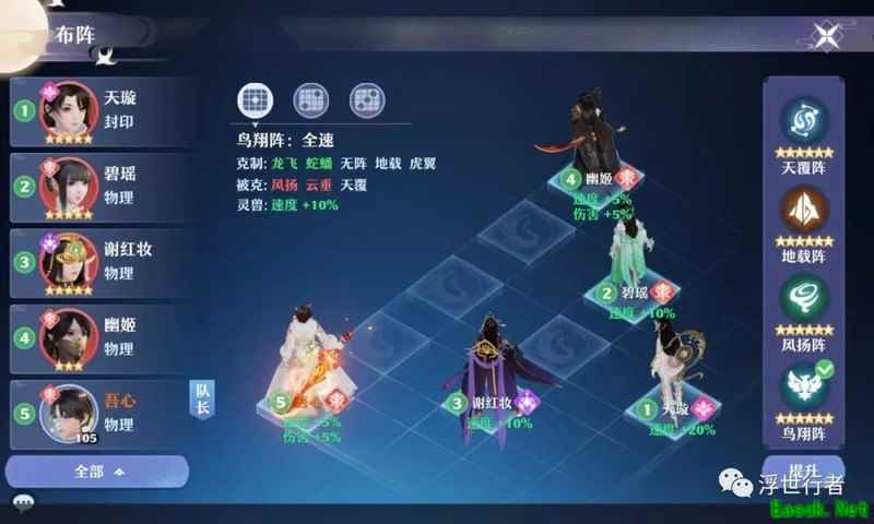 天璇/鱼南翔搭配碧瑶、鬼姬与萧无情,碧瑶攻速快并能获得物攻增益,鬼姬和萧无情为当前版本最强组合,星级足够时必上阵。 天璇搭配碧瑶、幽姬、谢红妆及青龙,若鬼姬与萧无情星级较低,可先以此组合过渡。 法宝推荐: