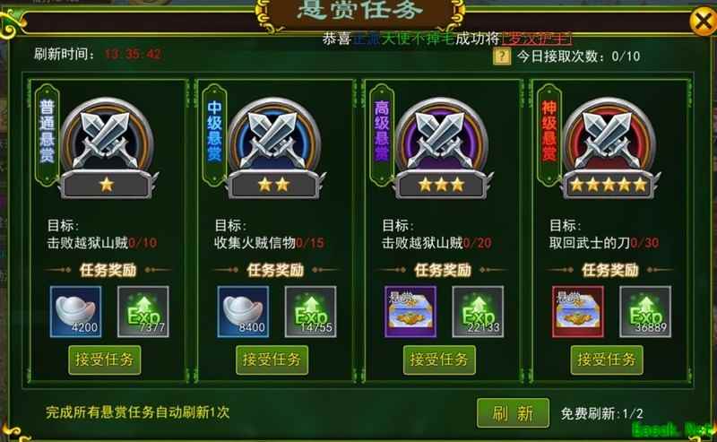 每天还有悬赏任务和跑环任务可以完成。悬赏任务每天最多可接取十次,建议刷新出至尊、高级或神级的任务来完成,这样不仅做起来更轻松,还能获得大量经验,升级速度也会更快。任务等级越高,难度越大,同时奖励也更丰厚。