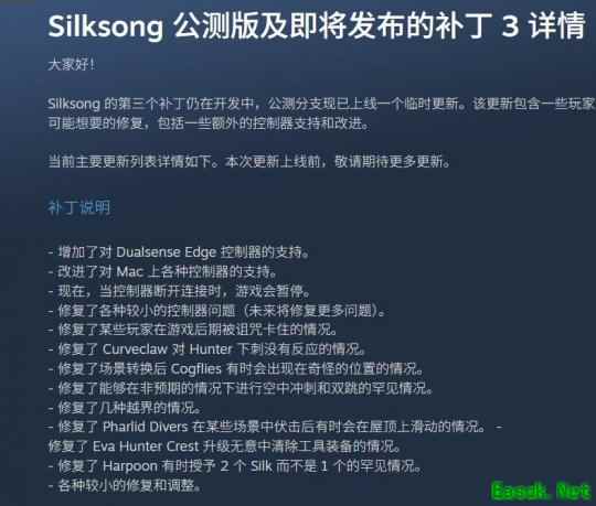 Team Cherry 已为《空洞骑士:丝之歌》发布了一个新的公测版更新,该更新在补丁 3 的持续开发过程中推出。此临时更新现已在测试分支提供,包含一系列修复与改进,玩家可在完整版发布前进行测试。 本次更新增加了扩展的控制器支持,包括与PS5 DualSense Edge 控制器的完全兼容,并修复了游戏玩法错误、移动不一致性以及各种后期游戏问题。Team Cherry 已确认在补丁 3 正式发布前还将包含更多调整。 完整补丁说明: 新增 对 DualSense Edge 控制器的支持。 改进 在 Mac 上对各种控制器的支持。 新增 控制器断开连接时游戏将暂停。 修复 各种较小的控制器问题(未来更新中将有更多修复)。 修复 某些玩家在游戏后期特定情况下被诅咒卡住的遗留问题。 修复 长爪对猎人的下劈攻击不起作用的问题。 修复 场景转换后,齿轮蜂有时从奇怪位置出现的问题。 修复 在少数情况下,玩家能够在非预期状态下进行空中冲刺和二段跳的问题。 修复 几处导致玩家卡出游戏边界的情况。 修复 在某些场景中,法利德跳蛛发动伏击后有时在屋顶上滑出的问题。 修复 猎人纹章在伊娃处升级意外清除已装备工具的问题。 修复 鱼叉极低概率产出2点丝绸(应为1点)的异常情况 其他 各种较小的修复与调整。 |