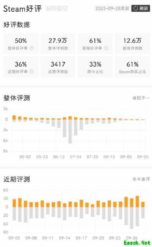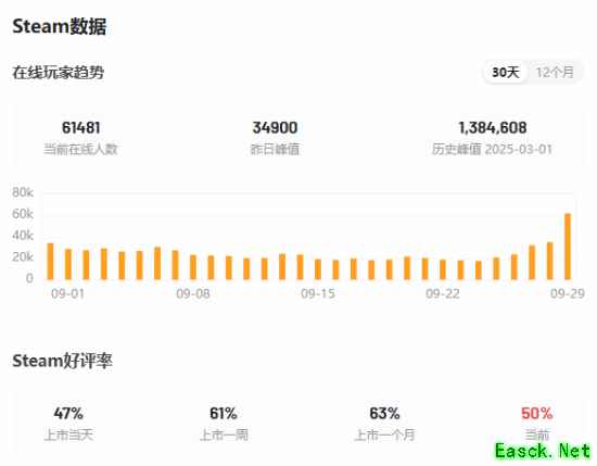 卡普空旗下《怪物猎人:荒野》大型免费更新第三弹已于9月29日正式上线!与《最终幻想XIV》的特别联动将会作为免费内容发布,玩家将与来自《FF14》舞台的强大怪物“游星欧米茄”进行战斗,“暗黑骑士”的猎人装备以及“绘灵法师”的绘灵魔法也将在《怪物猎人:荒野》的世界中登场!Steam商店页面>>> 在本次更新上线后,《怪物猎人:荒野》的在线人数现已突破了6万人。根据SteamDB数据显示,本作已重回Steam在线人数榜前10! 点击进入游民众评查看详细评价数据>>> 此外,本作的总好评率为50%、简中好评率为19%、最近一个月的好评率好评率为35%。今日截至写稿前新增的112条评价中,好评率为32%,差评率为68%。 本文由制作发布,未经允许禁止转载。 更多相关资讯请关注:怪物猎人:荒野专区 |