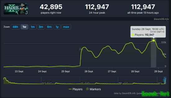 万众期待的《哈迪斯2》正式版已于9月26日正式推出,本作在第一部的基础上开发,为各位玩家带来全新的、充满活力的、可无限重玩的体验。游戏正式版已经上线,售价108元。 此前,游民曾报道《哈迪斯2》首次打破自身记录,突破了抢先体验时的数据。 今日现在它再次证明势头仍在,目前最高同时人数破十一万,达112947人,创造了新的记录,我们仍未知道《哈迪斯2》是否达到新的极限! 截至发稿时,《哈迪斯2》的在线人数在48小时表现依旧可以稳定在5w玩家以上,目前暂退4w人,由此可见玩家对这款游戏正式版的喜爱! 据了解,《哈迪斯2》是2020年好评独立游戏《哈迪斯》的同世界观续作,讲述前作主角妹妹、冥界王女墨利诺厄为解救家人与时间泰坦克洛诺斯及其盟友作战的故事。 值得一提的是,开发商Supergiant Games此前表示,再发布了《哈迪斯2》后他们需要休息一段时间,但也会密切关注游戏反馈,同时更新热补丁。 对此你怎么看,你有没有加入这场突破记录的时刻当中? 本文由制作发布,未经允许禁止转载。 更多相关资讯请关注:哈迪斯2专区 |
