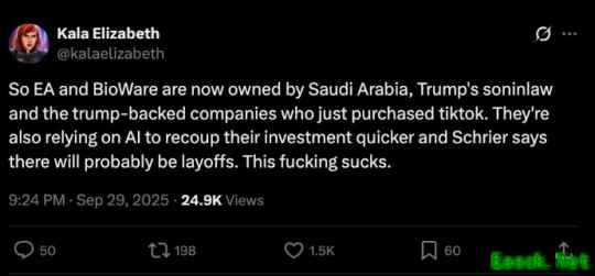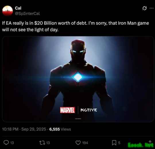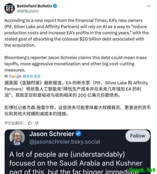 传言成真,EA已经官宣,接受550亿美元的私有化交易。出资方包括沙特主权基金PIF、美国投资公司银湖资本(Silver Lake),以及由美国总统特朗普女婿贾里德·库什纳创立的Affinity Partners。 然而,这笔交易在网络上引发了强烈的反弹,社交媒体上骂声一片。许多人甚至质疑EA旗下游戏系列的未来,认为在新领导层掌控下,EA的管理结构可能会进一步恶化。 有网友指出,这次参与交易的银湖资本正是此前传出将收购TikTok的那家公司。此外,这些投资公司都高度依赖AI来处理业务,这被认为预示着EA未来将迎来更多裁员潮。 彭博社记者Jason Schrier报道称,这笔交易将让EA背上200亿美元的债务。因此,这家游戏巨头很快会采取成本削减、激进的微交易策略以及裁员措施——这将是EA今年的第二轮裁员。 但也有玩家不认同白左记者Jason Schrier的报道:AI才是未来 另一条热门社交媒体评论则调侃道,这笔交易本身就是“最符合EA风格”的事,因为EA长期以来就以贪婪著称,被批评更像一个逐利的资本机器,而不是在乎电子游戏的公司。 那么,这对《战地》《模拟人生》《FC》等系列意味着什么?沙特以保守著称,因此外界担心在《模拟人生》等游戏中会出现更多反DEI相关的改动。 而在交易完成后背负200亿美元债务的情况下,有评论认为别对EA的项目抱太大希望。《钢铁侠》游戏很可能永远见不到天日,步上此前被腰斩的《黑豹》游戏的后尘。 |
