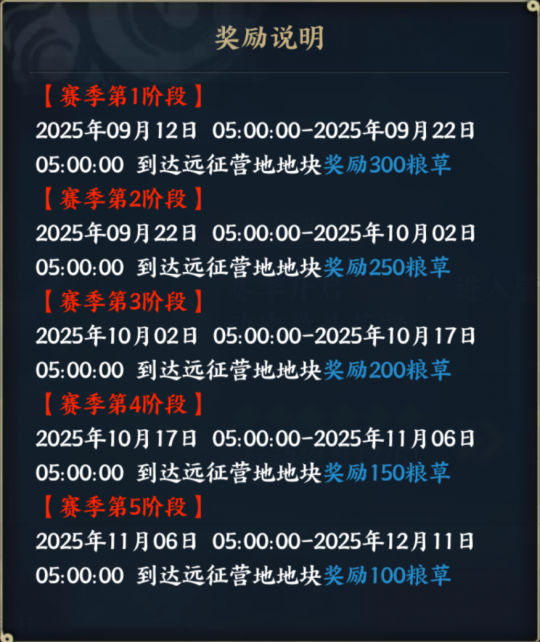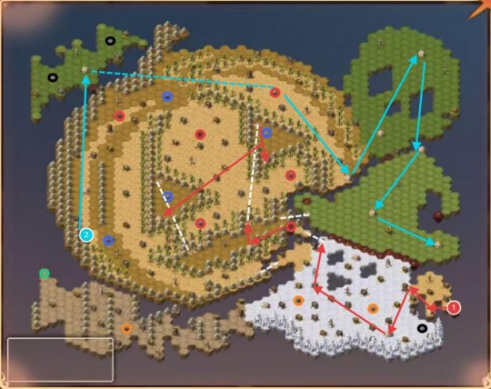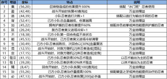 在《火影忍者:忍者新世代》中,上赛季身穿热辣泳装的玖辛奈,在大海和沙滩边上跟水门一起互动拍照,给大家留下了美好的夏日回忆。 而本赛季的忍界远征主题是“骨舞幽冥”,这次的远征令状忍者是“君麻吕[秽土转生]”,他是辉夜一族血继限界“尸骨脉”的持有者,对大蛇丸忠心耿耿,是音忍五人众中最强的一人。 ![]() 在第四次忍界大战中,君麻吕被秽土转生之术复活,保留了生前强大的实力。让我们跟着他一起看看新赛季的忍界远征路线思路与深度解析,还有新饰品“破晓”和“月华”的效果吧! ![]() 温馨提示: 1、本赛季的忍界远征将于2025年12月11日5点结束,远征排行榜于2025年12月10日22点结算,请勿错过; 2、探索地块的过程中,建议优先收集“远征”主题徽章,“晓”和“木叶”这两种主题徽章根据自身情况,按需获取; 3、赛季探索路线可分为三个阶段,分别是:“获取八卦徽章”、“快速占领远征营地”、“探索占领高级地块”。 ![]() 一、路线攻略: (一)远征营地的获取建议: 1、远征营地可获得的粮草,与赛季开启的时间阶段挂钩; 2、在不同阶段,占领远征营地所获得的粮草会逐渐递减; 3、在集齐“八卦徽章”前,如果遇到了远征营地,如果和规划的路线仅相邻2-3格,可选择顺路探索; 4、在集齐“八卦徽章”后,行动的路线建议优先以占领远征营地为目标,留好返回的路线,先占领远征营地后,再按照预留的路线折返将其他地块占领; 5、本赛季远征营地的粮草规则如下图所示: ![]() (二)影响排名的要素: 1、令状等级:等级越高,远征小队的数量和每日发放粮草数量越多,会直接影响忍界远征排名; Tip:购买远征令状等级所获得的经验不计算在排行榜内。 2、远征营地:在第一个月内,规划好路线优先将大部分远征营地占领,可获得更多粮草以获取更多经验;3、远征遭遇:总有8种,每个远征遭遇的作用和获取的远征经验不同; 4、远征首领:共有7个,挑战获胜后能获得较多经验和本赛季的新饰品; 5、主题徽章: ![]() (三)完整地图: ![]() (一)图中红色圆圈代表了“远征”主题徽章,该主题有8个子徽章。 (二)图中蓝色圆圈代表了“晓”主题徽章,该主题有4个子徽章。 (三)图中橙色圆圈代表了“木叶”主题徽章,该主题有3个子徽章。 (四)图中绿色圆圈代表了忍者学员的起始位置。 (五)图中黑色圆圈代表了历练之地的位置,忍者学员可以通过挑战分数获取更高奖励。 (六)图中白色圆圈代表了地图传送连通的地块。 (四)路线解析: 高经验思路:1、获取八卦徽章阶段: ![]() (1)想拿称号,第一天就要购买等级,具体请根据区服竞争情况衡量; (2)获得第一天优势的方法是:第一队走完6步并移动到第7步,再购买等级到59级以下,开启第二队(不能超过59级,否则会直接开启第三队,导致会走重复的路段);第二队继续走完后面6步并移动到第7步,购买等级到190,开启第三队。这样可以少走重复的路线,并且第二天起就能获得1600粮草/天; (3)箭头仅代表探索的大致方向,具体路线请忍者学员根据自己的情况制定; (4)争夺排行榜核心思路依靠1队(红色箭头,后续简称1队),2队(蓝色箭头,后续简称2队),以最快速度集齐8个“远征”主题徽章(红点); (5)2队在探索初期会有一段与1队重叠的线路,可使用飞雷神节省粮草; (6)线路若与传送点(白色虚线)相连,表示会使用传送功能。 2、快速占领远征营地阶段: ![]() (1)当收集齐8个“远征”主题徽章(红点)后,可根据自己队伍所在的地块位置规划路线(按上文思路,圆形数字符号为本阶段1/2队的起始位置),以较快速度占领远征营地; (2)依靠1队按照红色路线的方向占领远征营地; (3)依靠2队按照蓝色路线的方向占领远征营地,蓝色虚线是使用飞雷神瞬移的路线; (4)1队、2队在去占领远征营地时,尽可能留好返回的路线,减少用于走已探索过地块的粮草; (5)3队需根据自己的排名和粮草情况,判断是否探索初始地块附近的远征营地、商人和饰品地块; (6)线路若与传送点(白色虚线)相连,表示会使用传送功能。 3、探索占领高级地块阶段: ![]() (1)依靠1队探索红色圆圈范围的地块并挑战远征首领; (2)依靠2队探索蓝色圆圈范围的地块并挑战远征首领; (3)依靠3队探索黑色圆圈范围低级地块中的关键地块; (4)由于3队是在较低等级领地探索,获取的远征经验性价比要低一些,因此3队探索的多少要根据排名情况和剩余粮草决定,若远征经验领先不多,就要舍弃部分低级地块的远征商人,否则会影响排名; (6)主要靠1、2队探索高级(4、5、6级)地块,全部探索完毕后,再去探索低级(1、2、3级)地块,高级地块全部被探索后,可根据自己的剩余粮草选择不同小队行军; (7)收集齐8个“远征”主题徽章(红点)后的路线探索顺序,可根据忍者学员的喜好选择,合理分配粮草。 二、新区攻略: (一)推荐“增益”: 1、在探索的过程中,会出现“试炼场”地块,占领此类地块后,可以获得不同类型的增益,每个小队最多可携带6个增益; 2、可通过界面右下角的“地块检索”功能,再点击“试炼场[战斗]”查看到特殊地块的具体坐标; ![]() ![]() 3、增益的特点与说明: ![]() Tip:每位忍者学员的探索队伍使用的主角和忍者会有不同,具体获取到的增益跟自己的探索路线挂钩。 (二)探索阵容推荐: 1、宇智波斑[秽土转生·解]+天天[忍界大战]+汉[五尾人柱力]+疾风舞者 ![]() 打法技巧: (1)宇智波斑[秽土转生·解]能展开结界辅助小队忍者,首回合