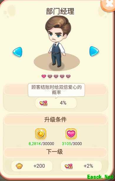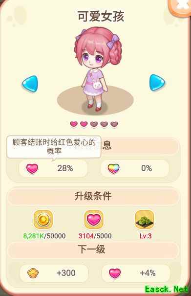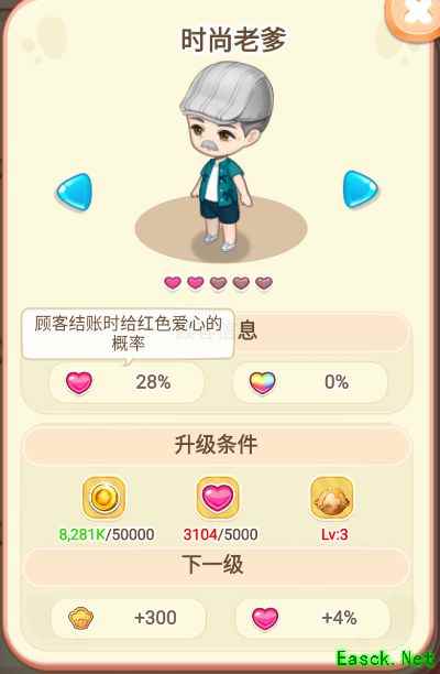 欢迎来到创意甜品屋!本期攻略教你如何高效升级顾客,用有限的爱心最大化收益。优先培养时尚老爹与可爱女孩,提升爱心获取概率,再进阶解锁翻倍秘籍! 各位店长好,今日为您揭秘顾客升级的实用技巧。 助力店长高效提升顾客等级与体验。 游戏中顾客拥有不同属性,前期爱心有限,应优先选择合适类型的顾客进行升级,以提升效率和资源利用。 【爱心来源】 结账时有一定几率获得爱心,为确保顾客进店消费,需时刻保持甜品柜中有充足商品供应,缺货会导致顾客流失。 【升级优先级】 优先提升和等级,可提高结账时获得的几率。 提升和两位的爱心值后,其出现概率将翻倍。 在两种顾客未升至满级前,所有爱心均应优先分配给这两种顾客。 其余顾客仅提升金币获取速度,非急需,无需优先升级。 加入我们,共享游戏乐趣! |