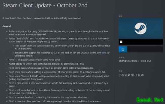 新版Steam客户端现已正式发布,10月3日,Steam官方发布了一篇客户端的更新说明文章,新增与修复了不少内容,体现在常规更新、游戏内悬浮窗口、游戏录制、Steam输入以及串流功能等多个方面,一起来看下。 更新内容如下(粗翻): 常规更新 • 新增针对Unity CVE-2025-59489漏洞的防护措施,当检测到利用尝试时将通过Steam客户端阻止游戏启动 • 新增32位Windows系统"终止支持"警告:目前Steam仅支持Windows 10 32位系统 Steam客户端将继续在Windows 10 64位系统运行,32位游戏仍受支持 对Windows 10 32位系统的Steam客户端支持将于2026年1月1日上午10时终止(详见官方公告) • 修复部分新闻帖子中出现""字符的问题 • 新增通过Ctrl+Tab快捷键切换标签页浏览器的功能 • 修复部分情况下"设为私密"游戏设置无法访问的问题 • 修复将大量非Steam游戏添加至合集时可能失败的问题 • 修复断连后部分"好友与聊天"设置偶尔暂时恢复默认值的问题 • 修复游戏触发成就时,悬浮窗口中用户成就信息无法显示的情况 • 修正赛后总结界面滚动箭头按钮直接跳转至末尾而非下一可见项的问题 • 修复Windows系统托盘图标菜单构建时可能发生的罕见崩溃 • 解决使用WindowsBlinds主题时客户端窗口持续放大问题 游戏内悬浮窗口 • 修复D3D12游戏中快速开关悬浮窗功能区域(如笔记)时可能引发的崩溃问题。该问题可能表现为游戏或GPU卡顿,在不同游戏中触发难度各异,是本周公开版及近期测试版的新缺陷。修复后将先在测试版验证,再以热更新形式推送全体用户。 游戏录制 • 提升使用Vulkan渲染引擎的游戏在开启录制功能时的性能表现 Steam输入 • 新增任天堂Switch Joycon组合模式下双陀螺仪支持功能 • 修复配置器中"监听键位绑定"面板异常 • 解决未安装游戏(需安装才可编辑配置)的配置界面打开时显示空白问题 • 官方配置制作现可通过"设置→开发者"选项实现,无需依赖SetInputActionManifestFilePath接口调用 串流功能 • 修复点击"串流"按钮无响应的情况 SteamVR • 修复退出SteamVR后Steam客户端通知被抑制的问题(被抑制的通知将在下次启动SteamVR时显示于VR头显内) 无障碍功能 • 优化游戏列表搜索与应用筛选面板的高对比度显示效果 Windows系统 • 新增检测当前设备安全启动( Secure Boot )与可信平台模块( TPM )启用状态。该信息显示于"帮助→系统信息",并纳入Steam硬件调查的参与数据收集。 Linux系统 • 修复连接DualSense手柄并处于闲置状态时的崩溃问题 本文由制作发布,未经允许禁止转载。 |