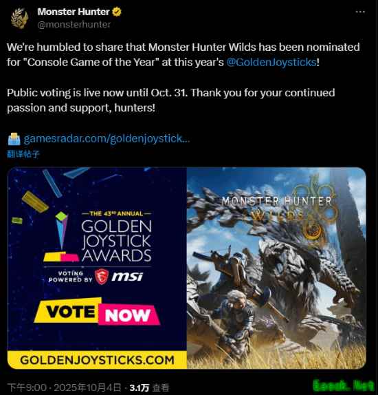 《怪猎荒野》入围金摇杆年度提名 玩家吐槽:不配!