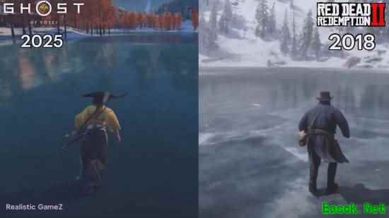 近日,推主GTA 6 Countdown发布了一段对比视频,将PS5最新独占游戏《羊蹄山之魂》的“冰面行走”动画,与7年前推出的《荒野大镖客:救赎2》进行对比。 视频: 《荒野大镖客2》的成功绝非偶然,它是多年技术积累与团队才华的集中体现。这款游戏的开发模式本身就是对资金、人力和时间的极限考验。据报道,《荒野大镖客2》的预算接近5亿美元,这不仅包括开发成本,还涵盖了庞大的市场营销开销。 《羊蹄山之魂》互动地图上线!囊括所有地图活动、武器铠甲、护身符、装饰物、收集品等点位。还配有详细图文指引,一站式解决所有攻略和收集需求!